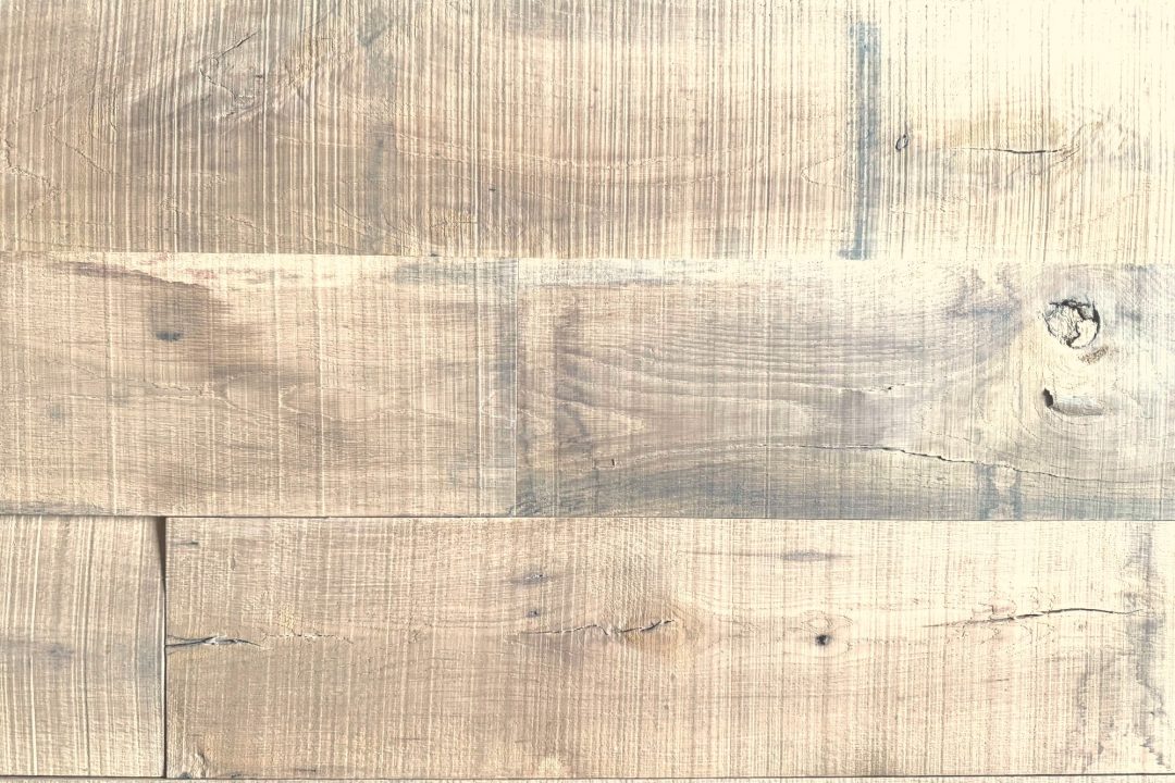 フローリング用原板の肌をそのまま活かした、かなりラフな質感のフローリング。凸凹具合がより激しく、帯鋸目と丸鋸目が混在することで、この上ない荒さを醸し出しています。ホワイト塗装を施すことで、明るいのに重みを感じる独特の表情に。とにかく荒く、本物の古材のような質感で、テーブルもチェアーも思わずガタつきます。