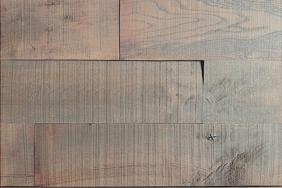 フローリング用原板の肌をそのまま活かした、かなりラフな質感のフローリング。凸凹具合がより激しく、帯鋸目と丸鋸目が混在することで、この上ない荒さを醸し出しています。グレー塗装を施すことで、褪色した古材に大変身。とにかく荒く、本物の古材のような質感で、テーブルもチェアーも思わずガタつきます。